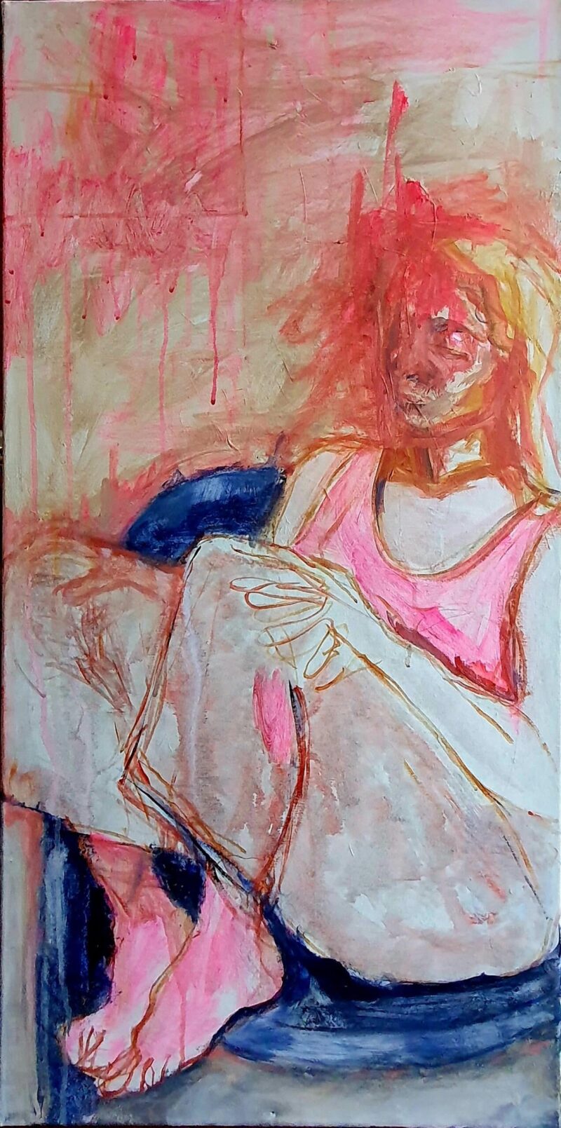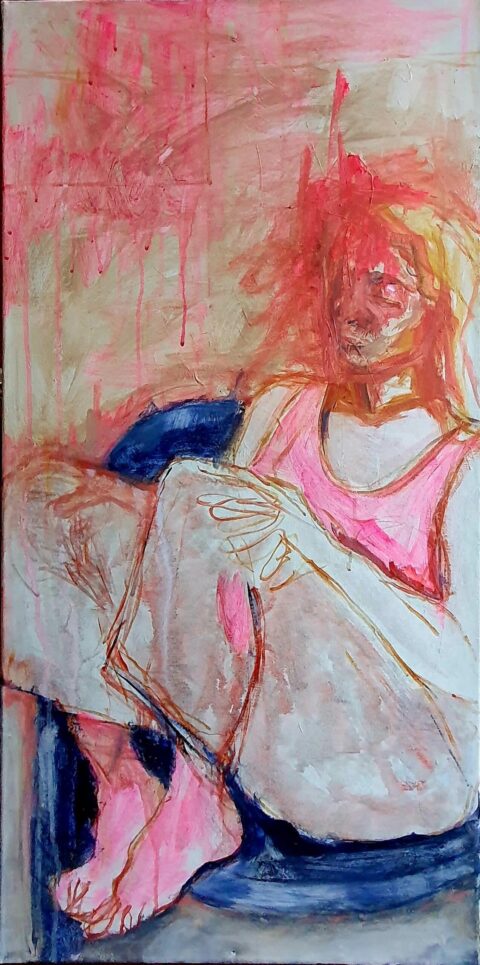 Mijn plezier zit in het live portretteren van mensen. Ieder mens is kwetsbaar en ieder mens heeft kracht, beide verhalen mogen er zijn. Maar wat er echt omgaat in iemands hoofd, blijft een mysterie. Zo was het ook met Mendi, een inwoonster uit Waalwijk. Zij poseerde voor mij in haar favoriete blauwe stoel. Het was een warme zomerdag. Ik weet niet waar ze aan dacht, maar het gevoel dat ze bij me opriep, heb ik proberen vast te leggen met een snelle toets (acryl op linnen, 50 x 100 cm).