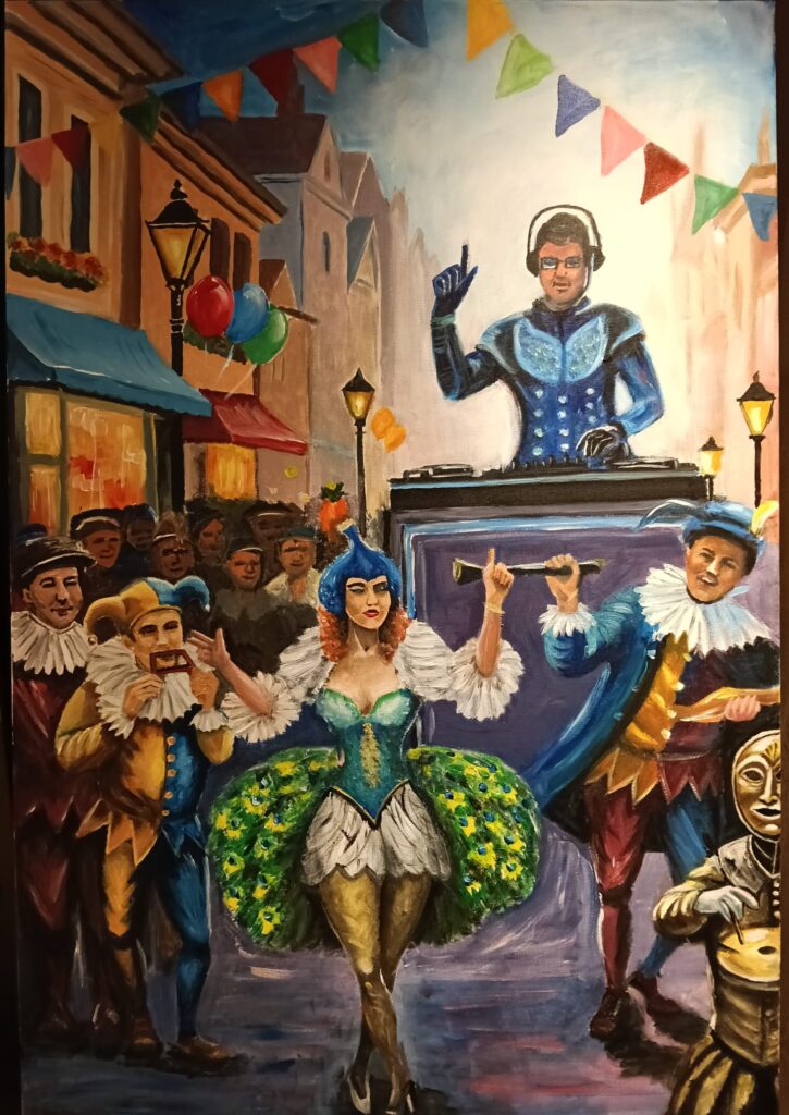 Carnaval, dat in o.a. Peejenland 66 jaar bestaat, is een prachtig feest, dat mensen verbindt, vrolijk maakt, aanzet tot bouwen van wagens en andere creaties. Het maakt me elk jaar weer blij in de donkere wintermaanden. Kind, ouder, puber of oma, ieder geniet van dit leutfeest. In mijn werk verbeeld ik vroeger en nu, in elkaar verweven.