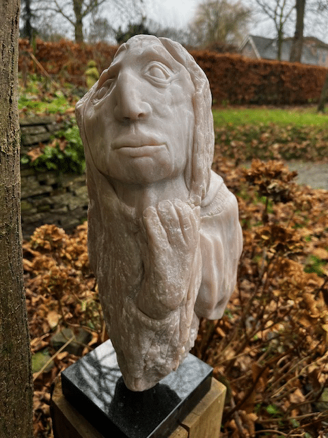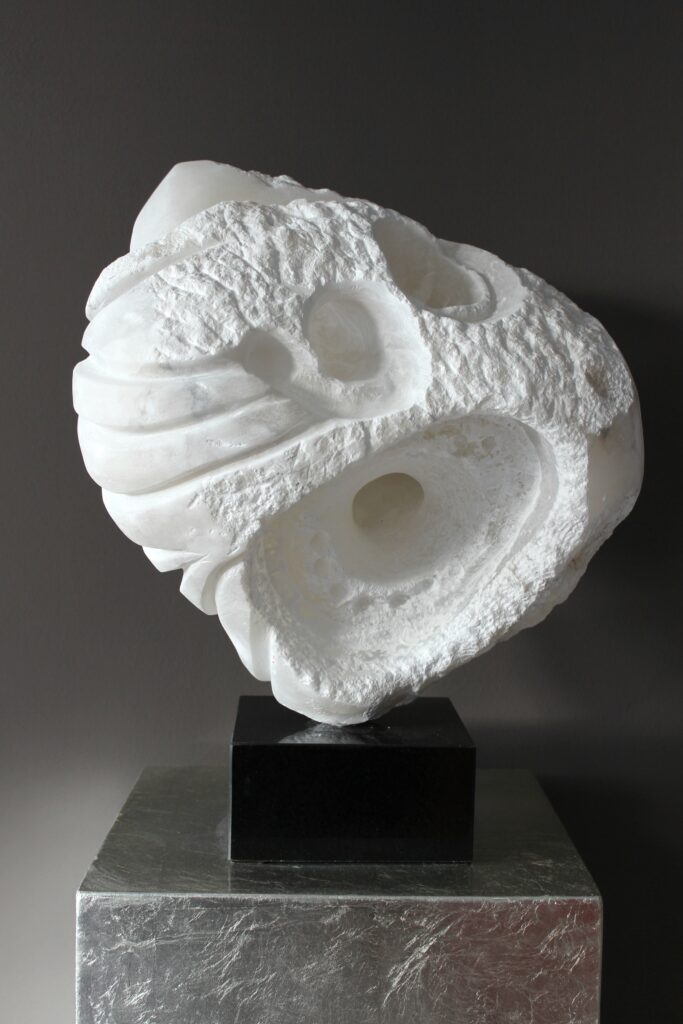 Ik heb bewust gekozen voor albast vanwege de kleur, de eigenschappen van deze steensoort, de vormen die ik ook in schelpen zag en vooral de doorzichtigheid van dit materiaal. Het beeld komt dan ook het best tot zijn recht als de zon schijnt.