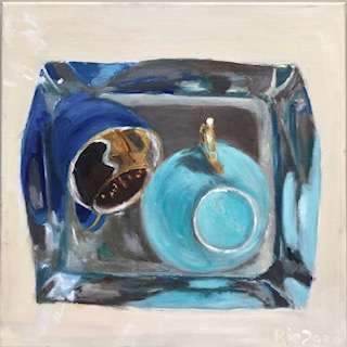 Met deze inzending wil ik graag een andere kant van mijn werk tonen. Dit schilderij, met als titel Three cups, maakt deel uit van een serie. Alle werken hebben als onderwerp kopjes die in een waterbak liggen. Door het water krijg je bijzondere vervormingen, Dat geeft mooie effecten!