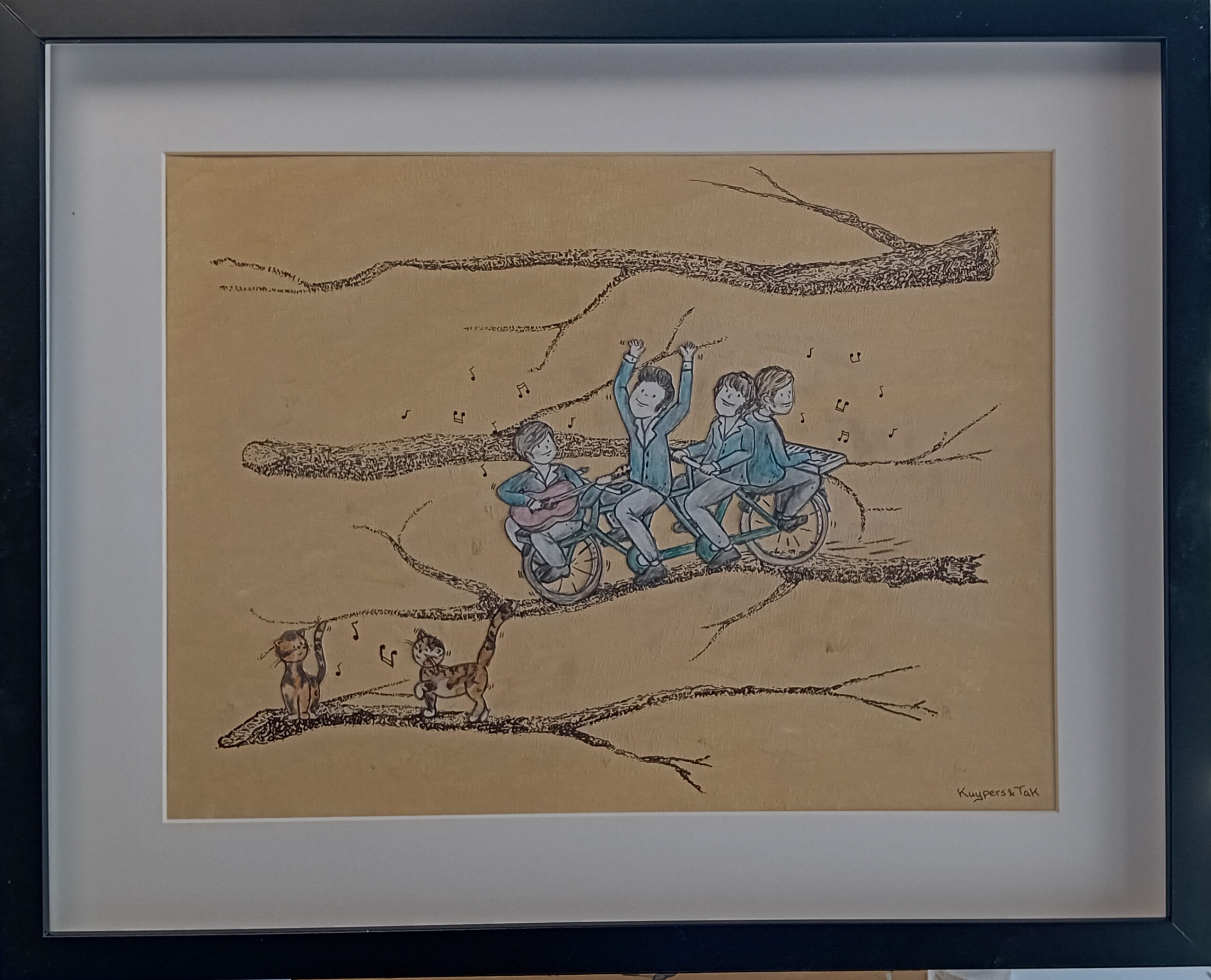 De band The Four Tak; wie zong er niet mee in de jaren 60, maar ook vandaag de dag. Met hits als: " de Tandem" en" Onze poes en Buurmans kater". Een cultureel erfgoed waar al vele generaties van kunnen genieten. Gekozen is voor de tandem, omdat deze ook staat voor samen en samen hebben wij dit werk gemaakt. Frits verzorgde de achtergrond met de 4 takken en Suzanne voegde de illustratie toe. De muziek en de teksten van the Four Tak waren van een mooie eenvoud, deze eenvoud komt terug in het werk.
