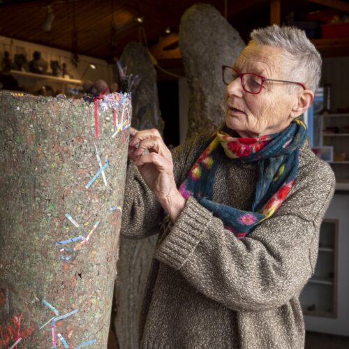 Gerry Peene werkt al meer dan 20 jaar met papier. Zij wil niets extra toevoegen aan de afvalberg met haar kunst. Het is haar bedoeling afval juist tot kunst te verheffen. Gerry werkt met gewoon papier, de krant, huis aan huis reclameblaadjes, slingers e.d.